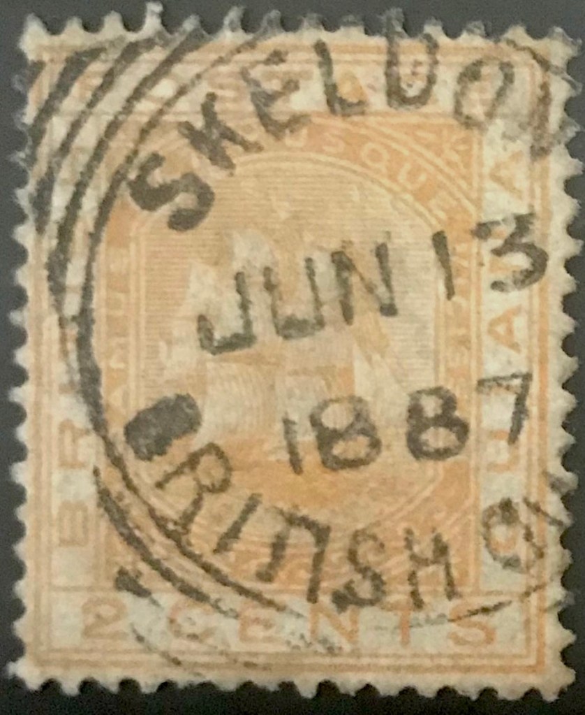 The Skeldon Circular Date Stamp (C.D.S) is a Panda Type E7 postmark. The Panda Type E7 is Double Ring (D.R.) 23 – 24.5 / 13 – 14.5 mm. 2 L.D. with Y.A. B. Guiana at foot