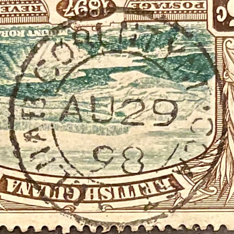 The Benab Circular Date Stamp (C.D.S) is a Panda Type E28 postmark. The Panda Type E28 is Single Ring (S.R.) 27-28 mm. 3 L.D. with Y.I.F. and Y.A. B. Guiana at foot.