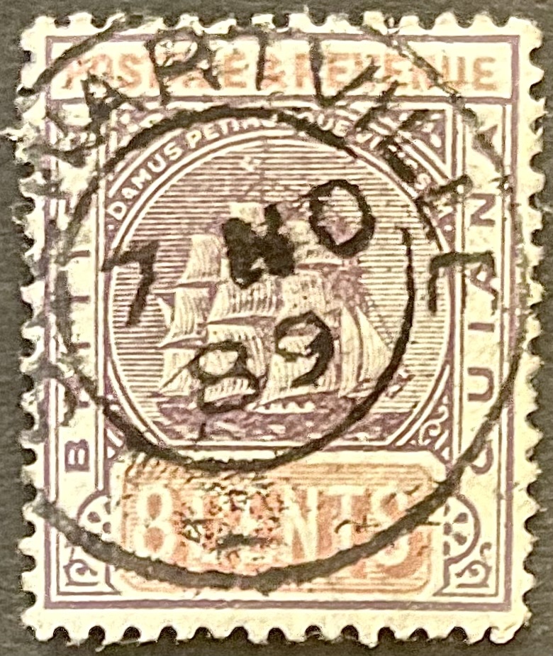 The following are the Date Stamps used at Stewartville with EKD prior to 22 January 1901, the day marking the end of the reign of Queen Victoria. In addition to listing the Panda Type #, for reference, we also list the T&H Type from The Postage Stamps and Postal History of British Guiana by Townsend & Howe, the Type and referenced page from The Postal History of British Guiana by Edward B. Proud, and the referenced pages from British Guiana Coded Postmarks – Study paper No 3 by Michael Rego, for code-marks.